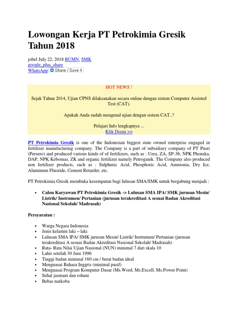 Lulusan sma (ipa)/smk (akreditasi a) dengan jurusan sesuai daftar terlampir; Pt petrosida gresik adalah anak perusahaan dari pt petrokimia gresik (persero), perusahaan pupuk terbesar dan terlengkap di indonesia. Pada kesempatan kali ini, pt petrokimia gresik membuka lowongan kerja untuk posisi pelaksana (grade 6a). Tersedia loker untuk berbagai kalangan dari lulusan sma, smk, fresh graduate. Keberadaan pt petrokimia gresik adalah untuk mendukung program pemerintah meningkatkan produksi pertanian nasional.